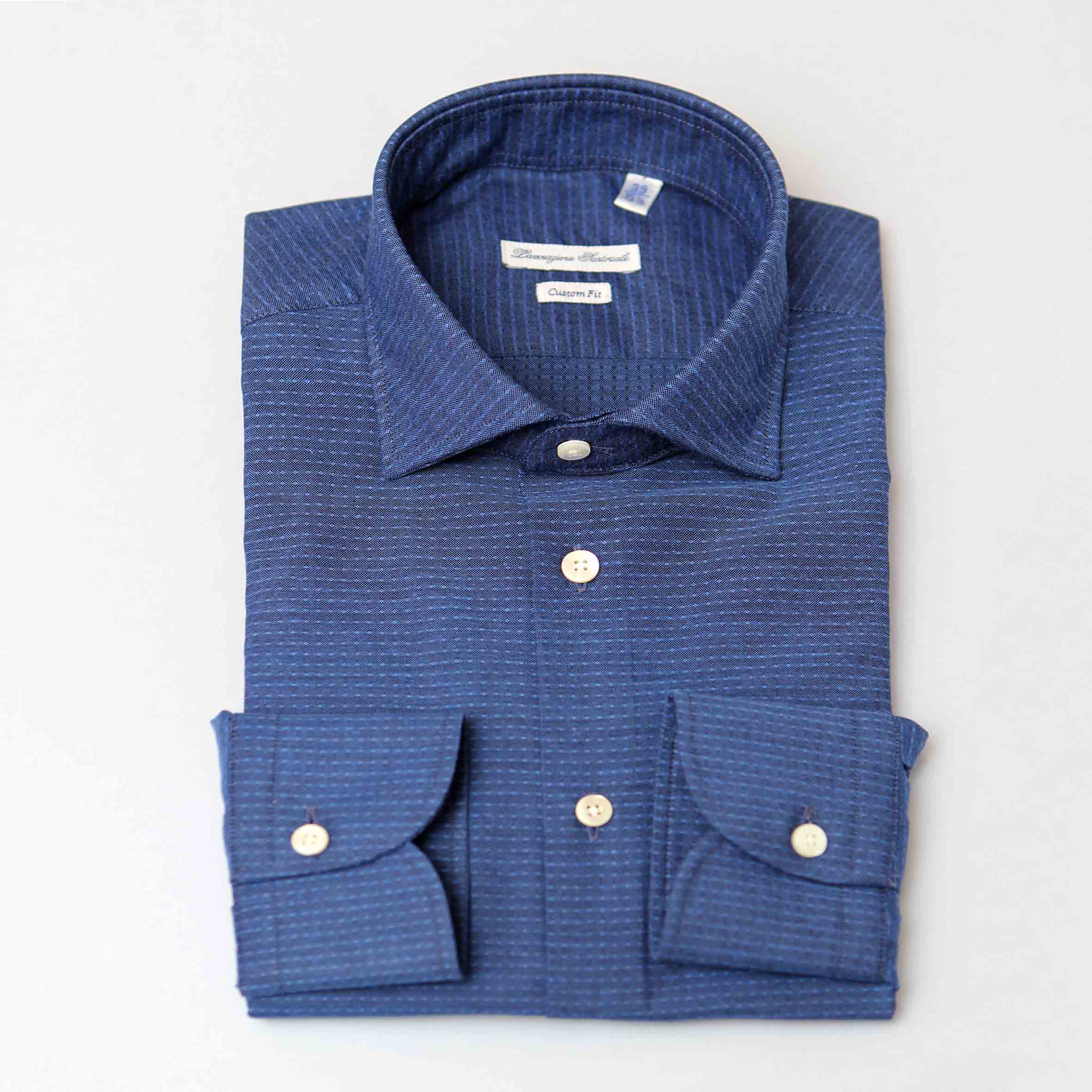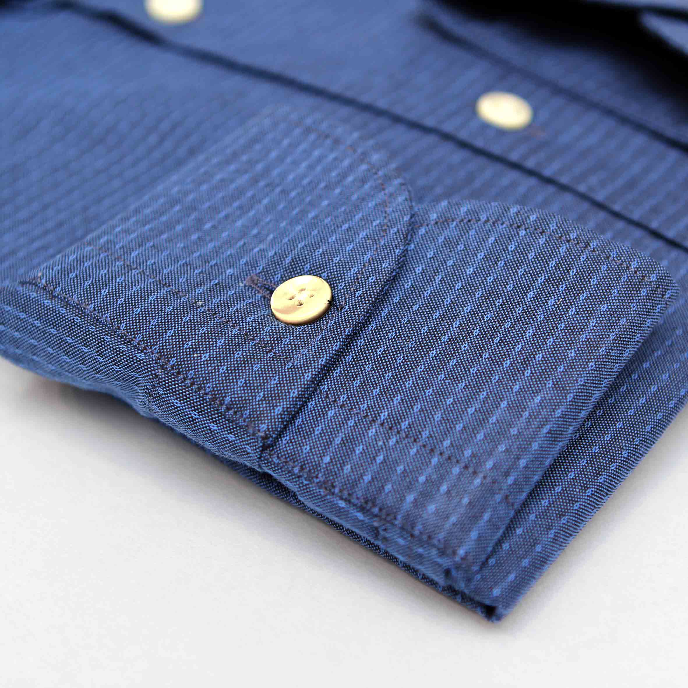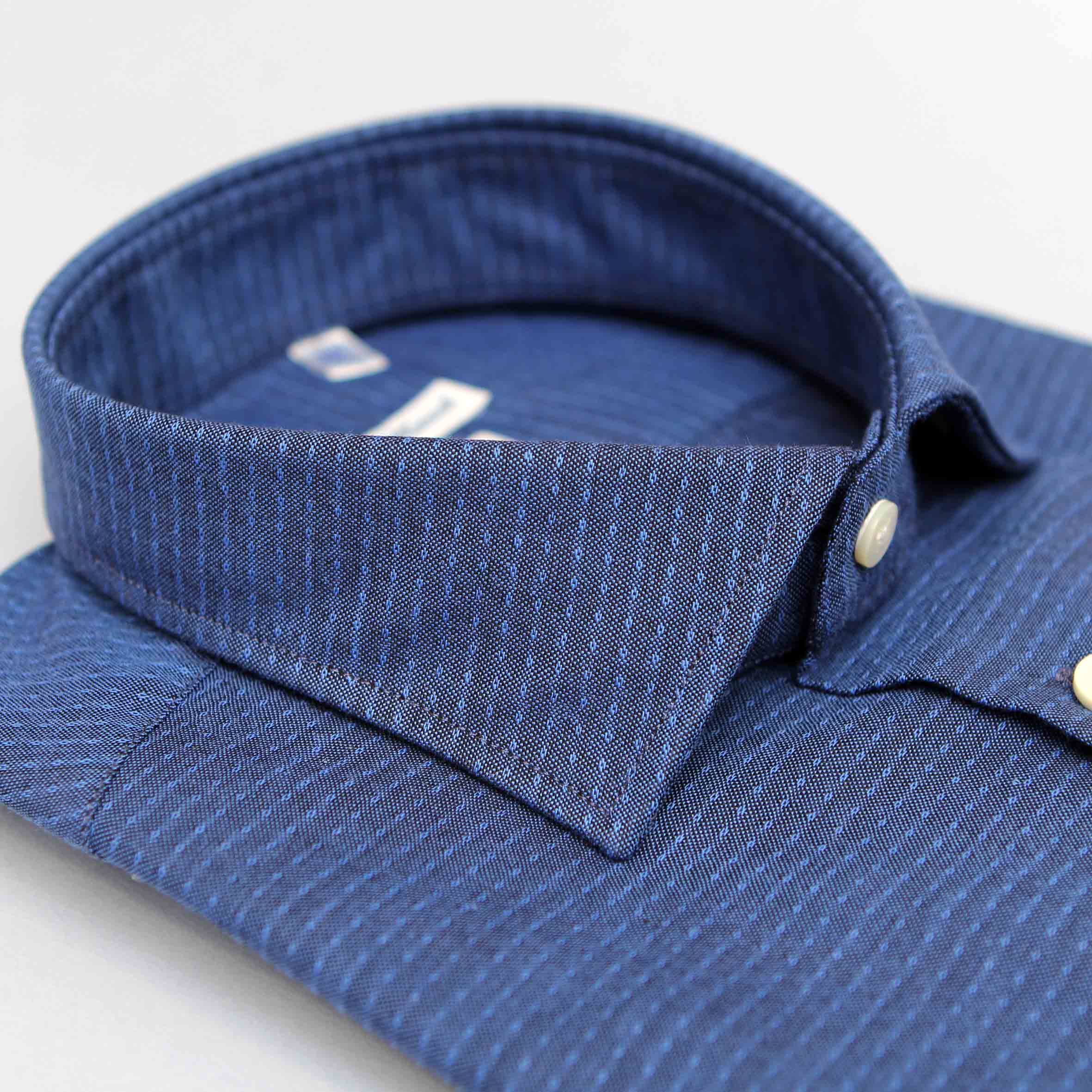 Camicia azzurro trama con puntino,100% cotone, vestibilità custom, collo francese.