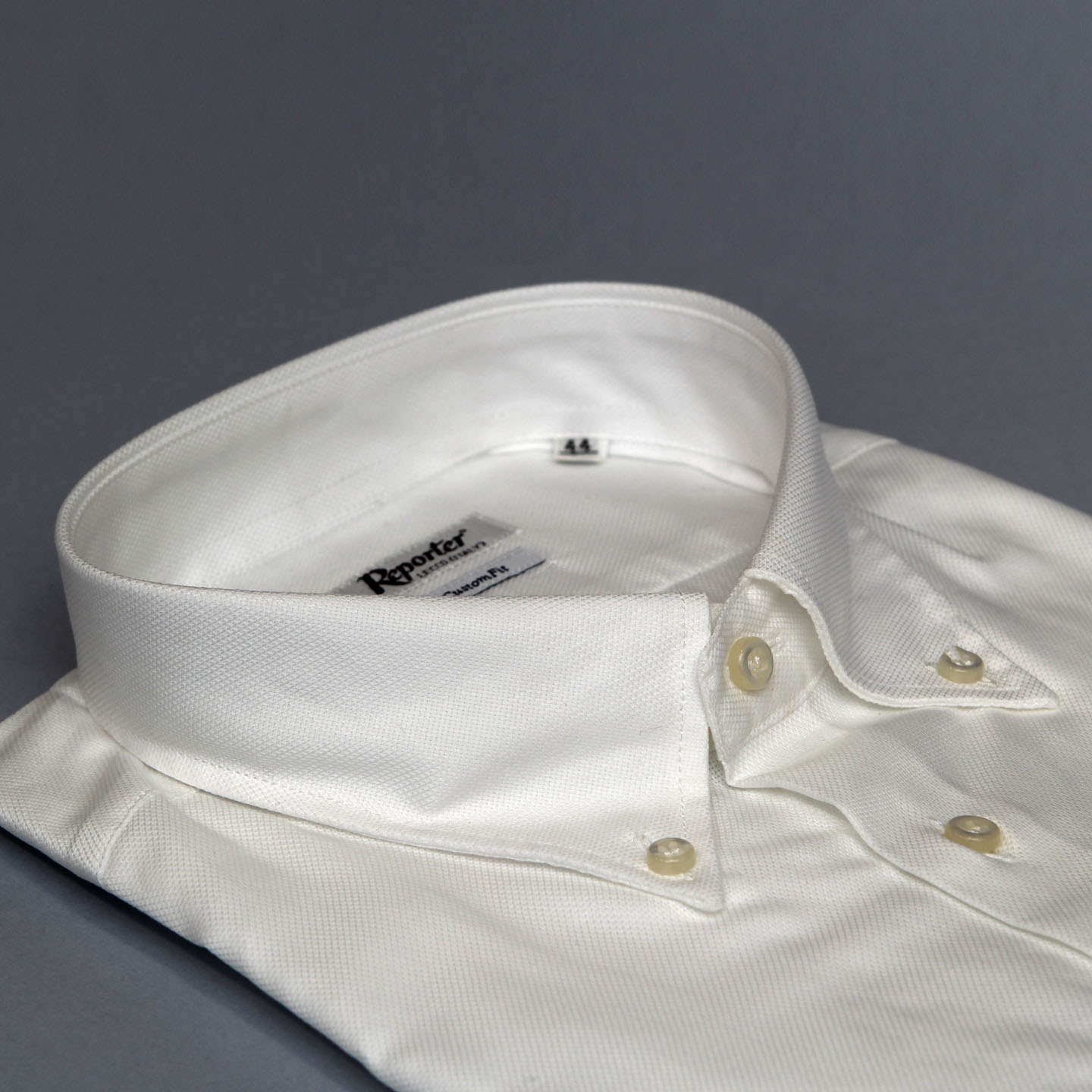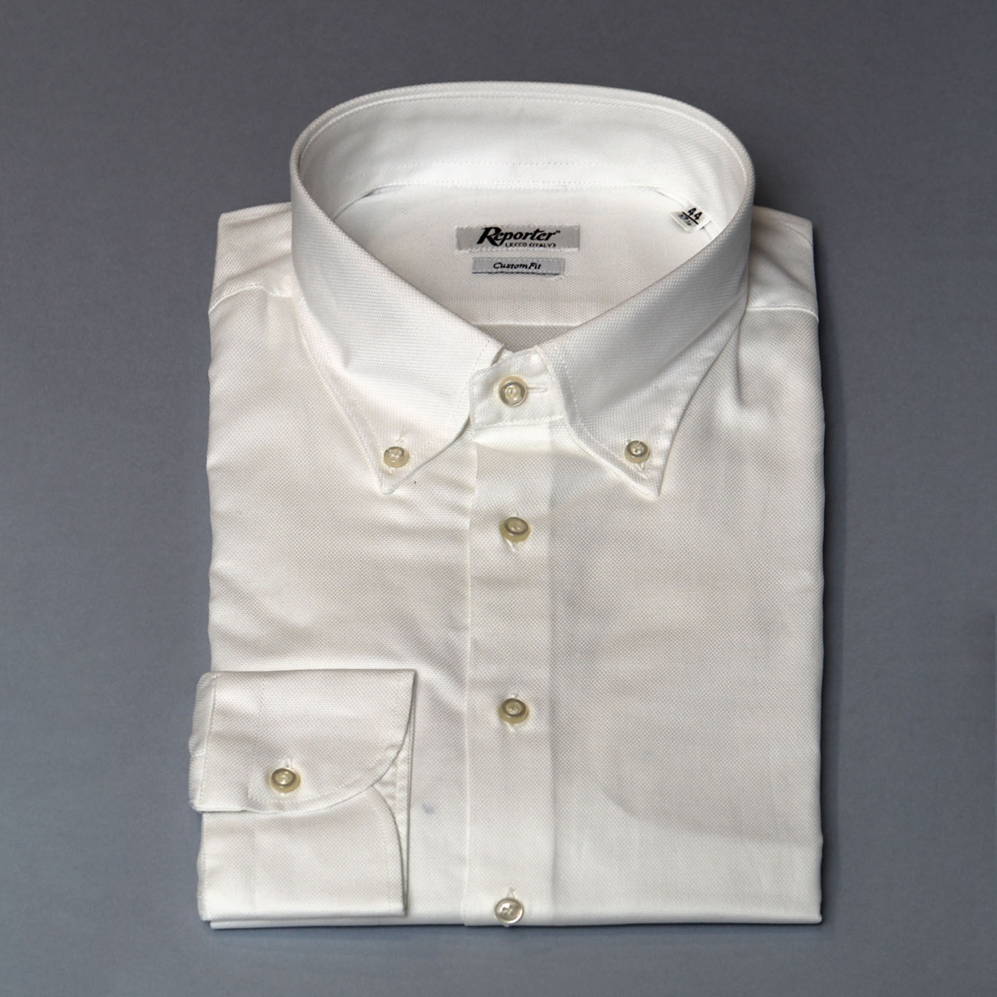 Camicia oxford bianca, 100% cotone, vestibilità custom, collo button down.
