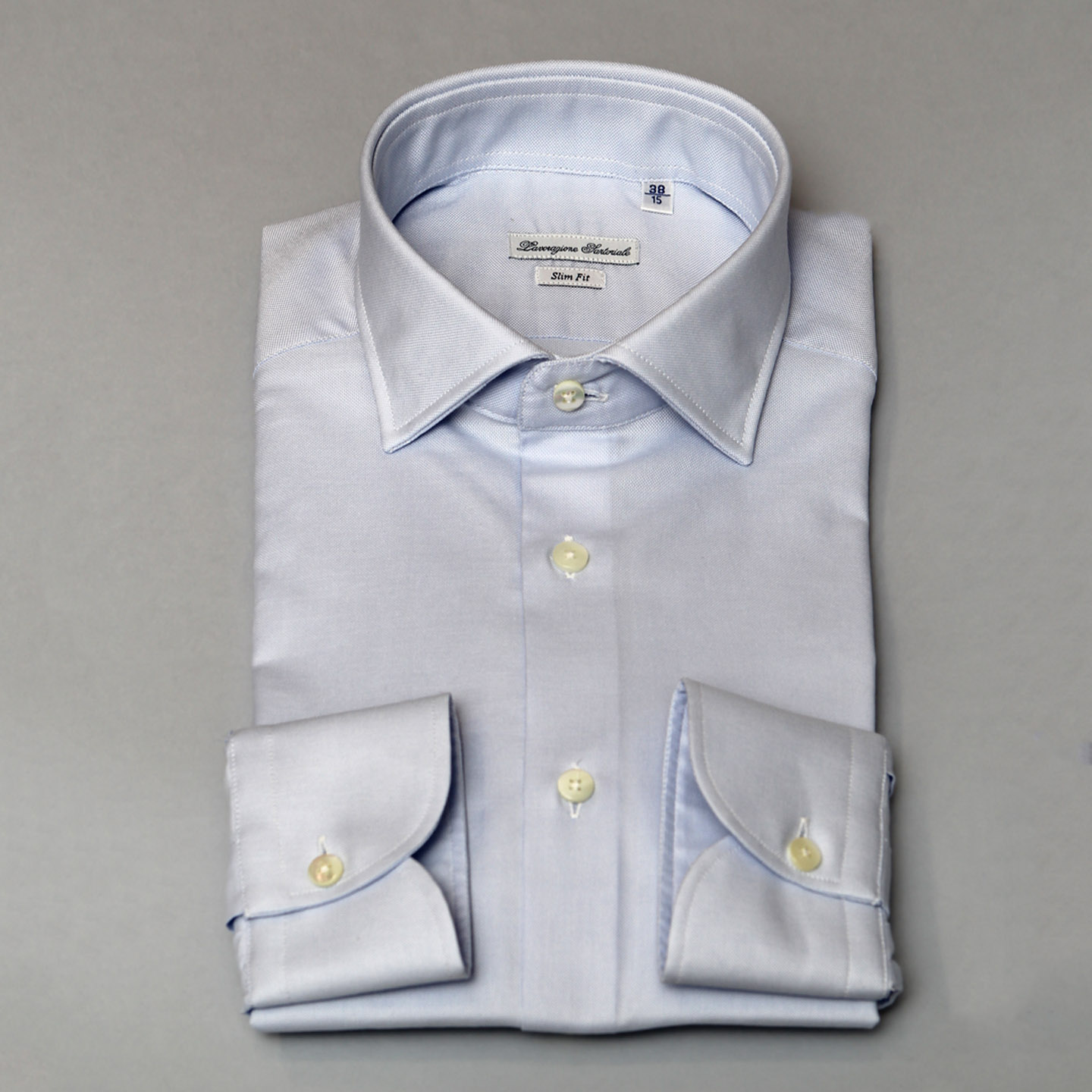 Camicia oxford celeste,100% cotone, vestibilità slim, collo francese.