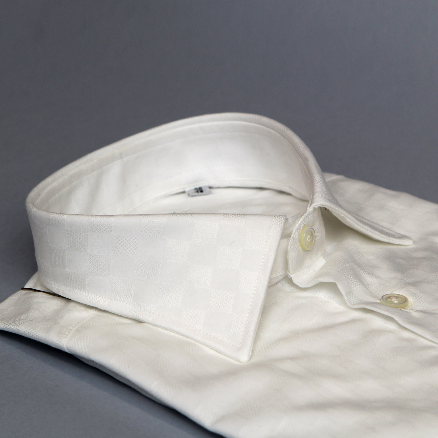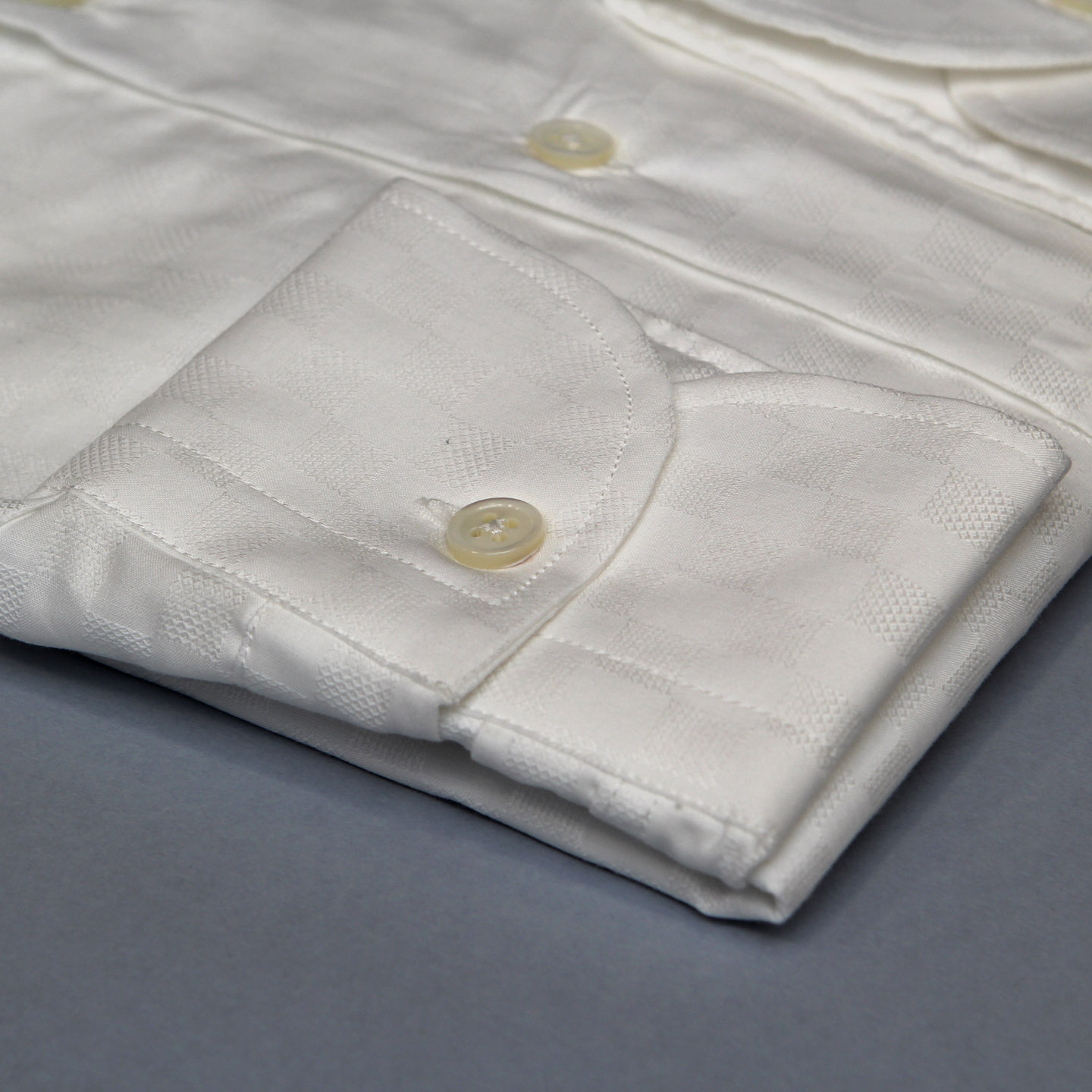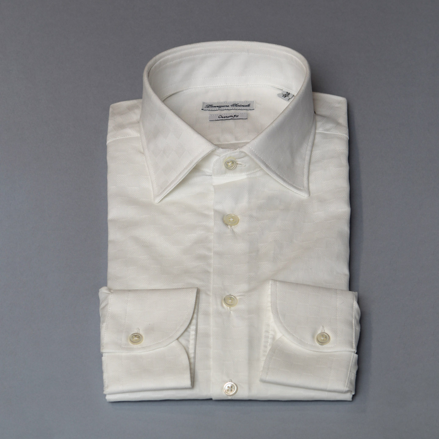 Camicia bianca disegno mattonella, 100% cotone, vestibilità custom, collo francese.