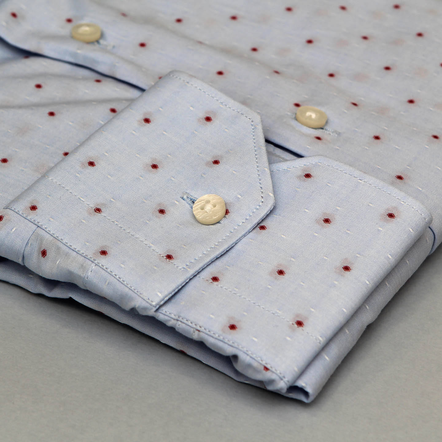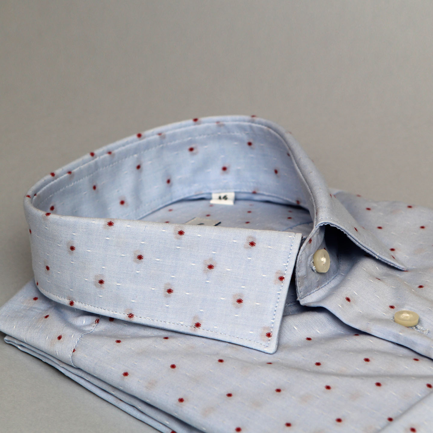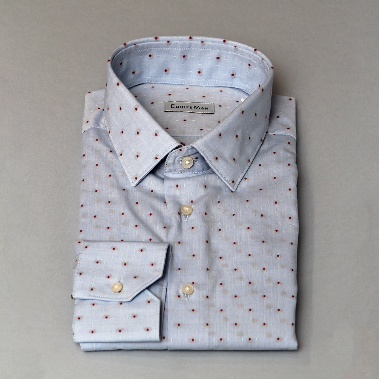 Camicia celeste con puntino rosso, 100% cotone, vestibilità slim, collo classico.