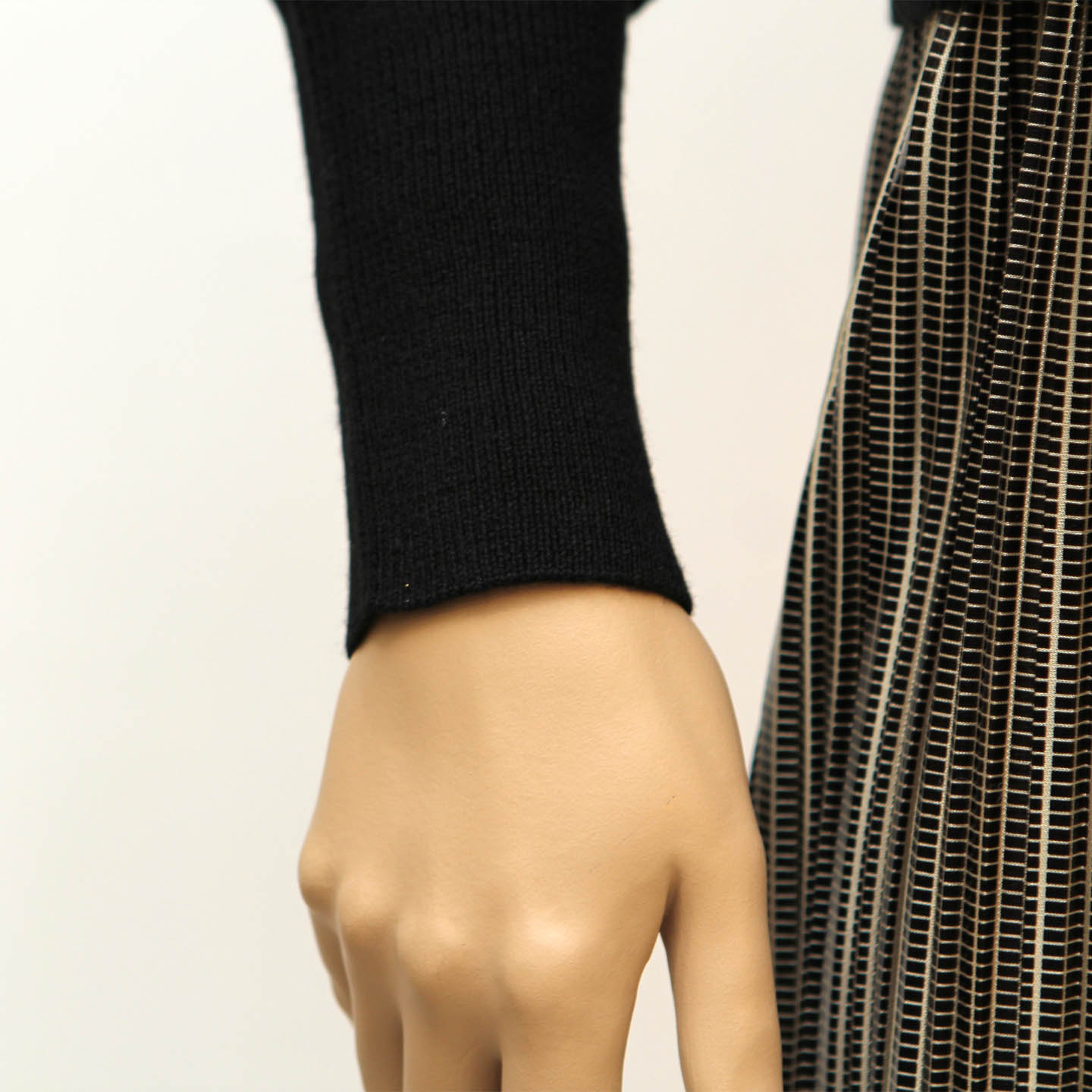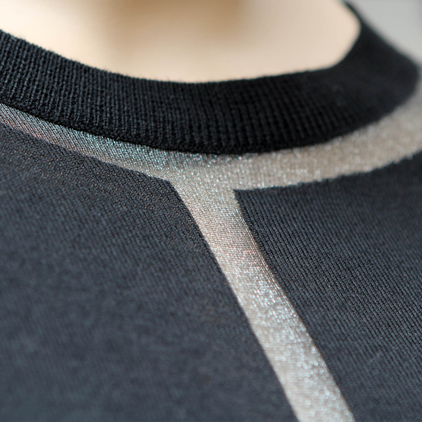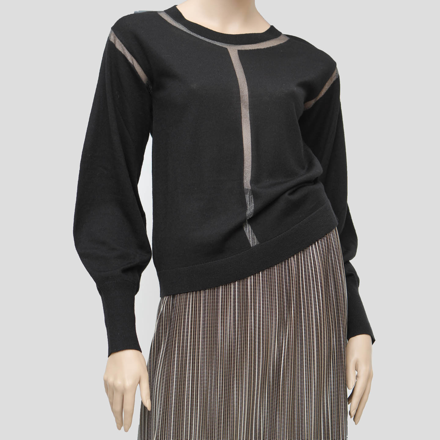 Maglia scollo barca misto lana; linea dritta con dettaglio frontale trasparente; maniche a palloncino con polso alto.