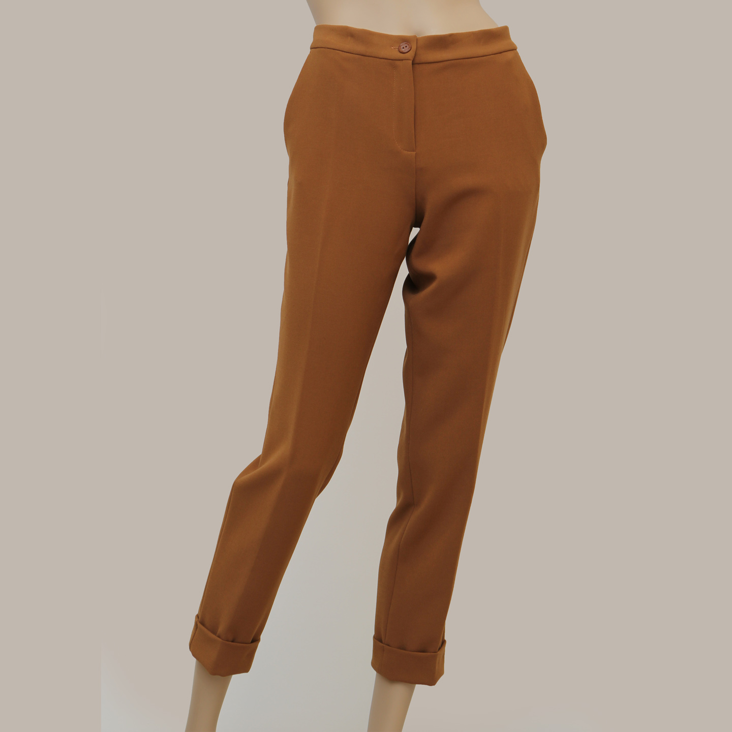 Pantaloni in tessuto crêpe elasticizzato; tasche alla francese, piega stirata fronte e retro; chiusura con bottone e lampo nascosta; risvolto sul fondo.